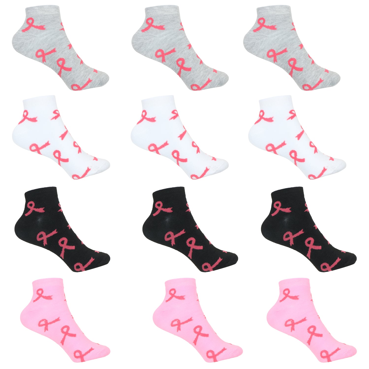 12 Pairs Women’s Lightweight Pink Ribbon Cotton Ankle Mid Quarter Mini Crew Breast Cancer Caual Socks